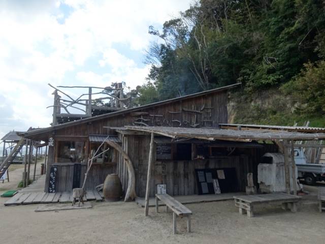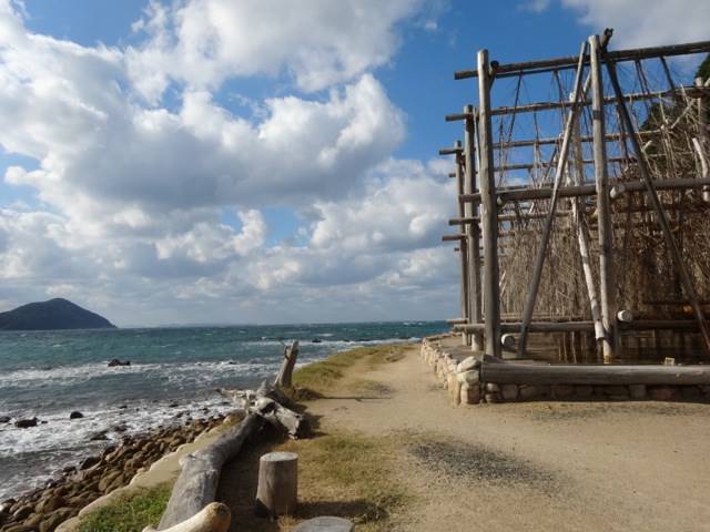 という感じで、正面は海・海・海!!なんです。よく見てみると、 木でまたいちの塩って飾っているの分かりますか?なんだか、ほっこりしますよね。こちらの塩は、 この立体式の塩田(流下式塩田というらしいです)を利用し、上から海水を落とし竹の枝をつたって落ちる間に日光と風の力を借りて塩を精製していくんだそうです。