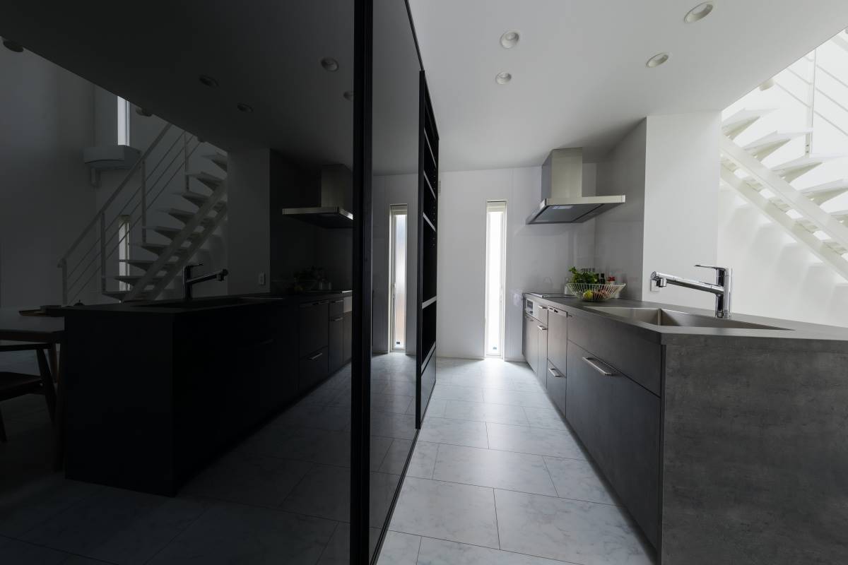 グレーの面材とブラックガラスのバック収納にするとまた全く違うモダンな雰囲気になります。