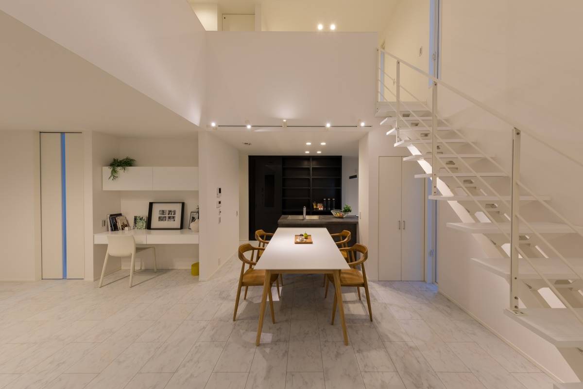 一方、こちらは石目調の床材を貼ったcube。木目とは違ってモダンでシャープな印象になります。階段も白で合わせています。