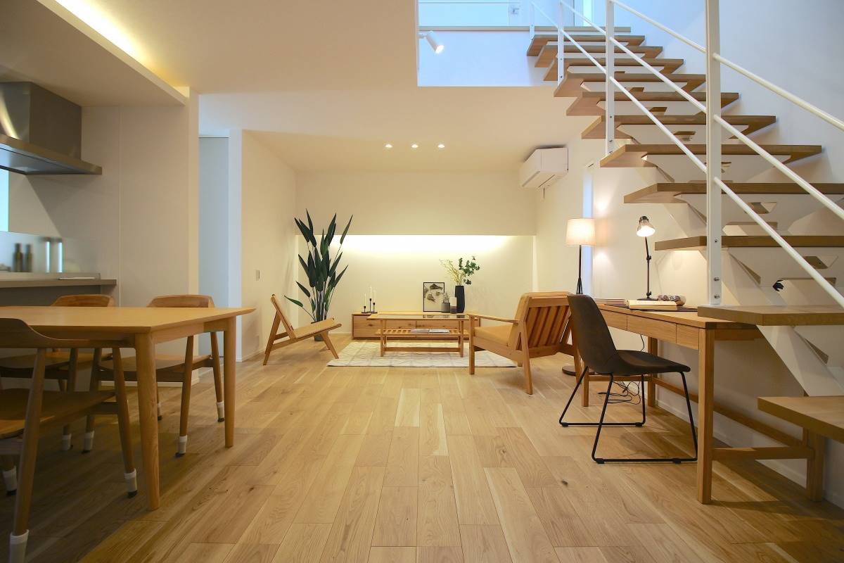 現在分譲中の中庭がある高田のcube。こちらの床材はオークの三層フローリングです。表層が無垢の木材でできており、肌触りが良く風合いも良いです。木目の優しい雰囲気がナチュラルな印象を与えます。階段も同じオークの木材です。