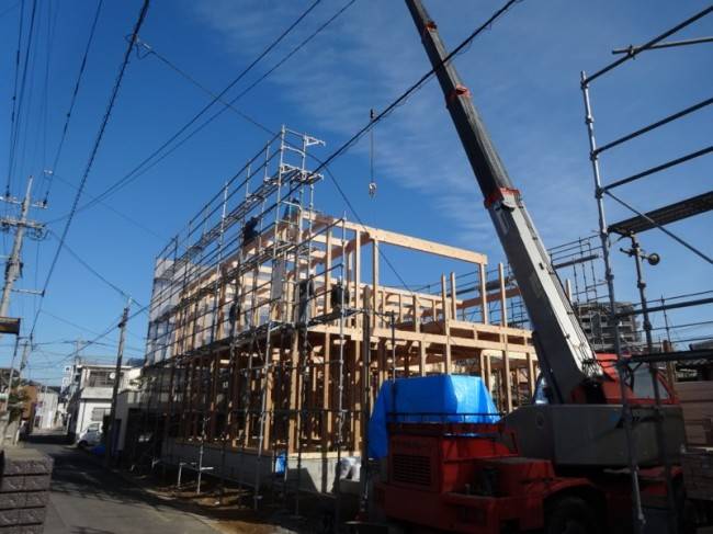 先日、T様邸が無事に上棟いたしました。ずっと天気が悪い週だったので、心配でしたが当日はすばらしい晴天!!さて、作業は順調に進行。