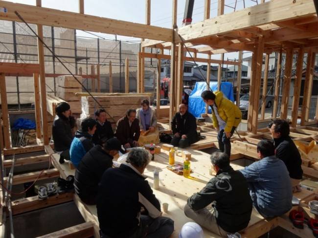 最後は、関係者一同で上棟を終えたばかりの建物を背に