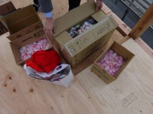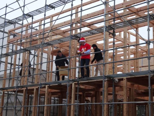 すると、ここでサプライズが!!この日は、25日。そう、クリスマスです。 お施主さまがサンタになり、来てくれたご近所の皆様に縁起物を振る舞いました!サンタが餅を・・・とちょっとミスマッチな組み合わせですが、良く良く考えてみると紅白餅と色が同じなんですよね?♪
