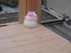 お昼は、お施主さまが準備していただいたお弁当を関係者でごちそうになり、終始和やかな時間を過ごしました。 お昼からは、一気に作業を進めて無事に上棟! 上棟後には、餅投を行いました。隅に餅を備えて、準備も万端!