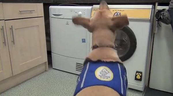 それは、犬がコントロール可能な洗濯機「Woof to Wash (ワン!で洗濯)」。Woof to Wash は、身体障がい者のために開発された洗濯機です。障がい者補助犬が飼い主に代わって洗濯ができるよう、様々な工夫が施されています。