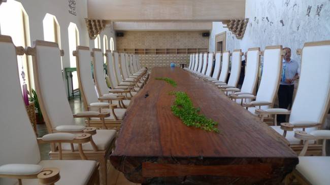 以前から、何度かお邪魔している中国の内装トップクラス企業「ボローニ」? お邪魔して、最初にとおされた会議室。けやきの一枚板のテーブル。板というより、もう半分した木をテーブルにしたような迫力一体何メートルあるのか、スケールの大きさにびっくりです。壁と椅子のコーディネートも爽やかで美しいです。?