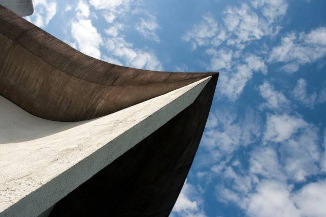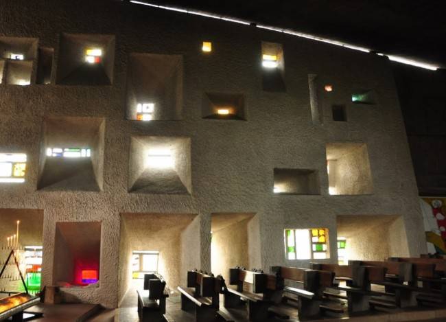 (写真googleより)鉄筋コンクリート造にスタッコによる白くて分厚い、大きな曲面の壁と、シェル(貝殻)構造を用いた美しい曲面の屋根が象徴的な彫塑的な建築であり、その分厚い壁にランダムに配置された小さな開口部にはさまざまな色のステンドグラスが嵌め込まれ、そこから差し込む光の拡散によって、荘厳で神秘的な内部空間を現出させている。