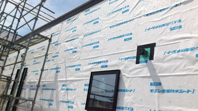 写真は構造用面材の上に透湿防水シートを重ねている所です。