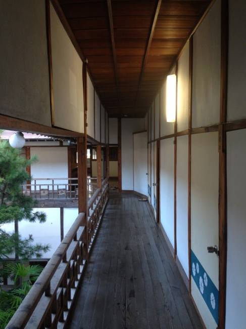 玄関から階段を上り2階に案内されました。磨き上げられた階段です。ピカピカ?!全体的にものすごく手入れの行き届いた建物でした。2階の廊下と中庭です。建物自体がロの字で中庭にある作りでした。部屋の中です。立派な床柱(これもピッカピカでした)天井の写真です。(かなり凝った作りになっていました)ちなみに部屋の名前が昔の女性の名前で当時の遊女?さんのお名前のようでした(ちょっと怖い・・・)