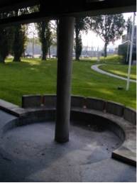 (オランダ:アムステルダム‐子供の家 アプローチ周辺の庇の柱を利用したベンチ)