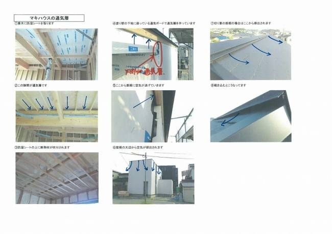 断熱をした内壁・屋根内部と仕上げの外壁と屋根の間の空気の層を作ります。(通気層の作り方や排気の抜き方は、各施工会社の工法や仕様により異なります)