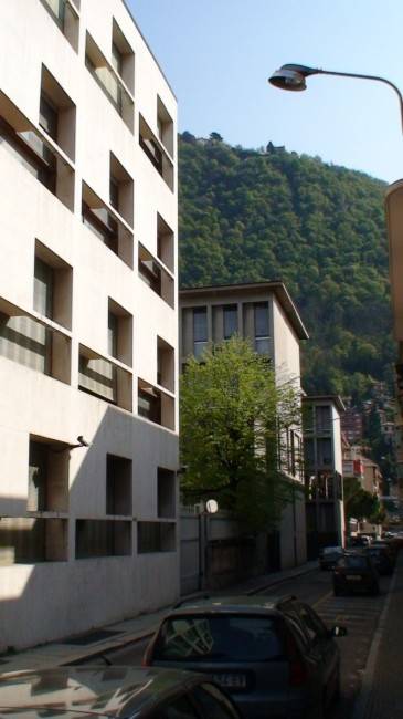 コモ湖周辺の風景一件、単調とも思えるこの建築は、全て√2の比率による構成によって成立されている。極めて単純で且つ、頑ななまでのルールを強いる事で、見る者へ威圧感と畏怖を感じさせるような印象がある。建物側面建築された当時の時代および政治的背景も鑑みながらも、これだけの建物を成し得た設計者には畏敬の念を覚えます。
