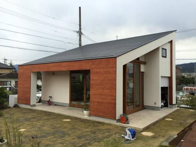 (写真1)こちらは昨年末完成したテラスハウス。外壁正面に本物の木を貼っています。