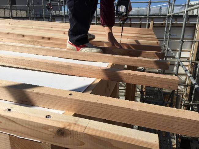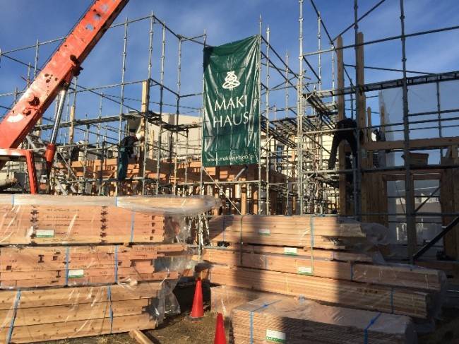 クレーン車のセットも終わり作業開始いたします。あっという間に柱が立ち並び次は2階の床組に入ります。クレーン屋さん出番です。2階床の金物締めと床下地合板貼りも終わり、次は2階の柱と小屋組みです。棟も上がりここまでくれば棟梁もひと安心でコーヒータイムです。休憩も終わり屋根の下地組に入ります。破風の取付けまで完了し屋根下地合板貼りです。だんだんと家の形になってきました。屋根防水シートの施工も終わり棟上げ完了しました。