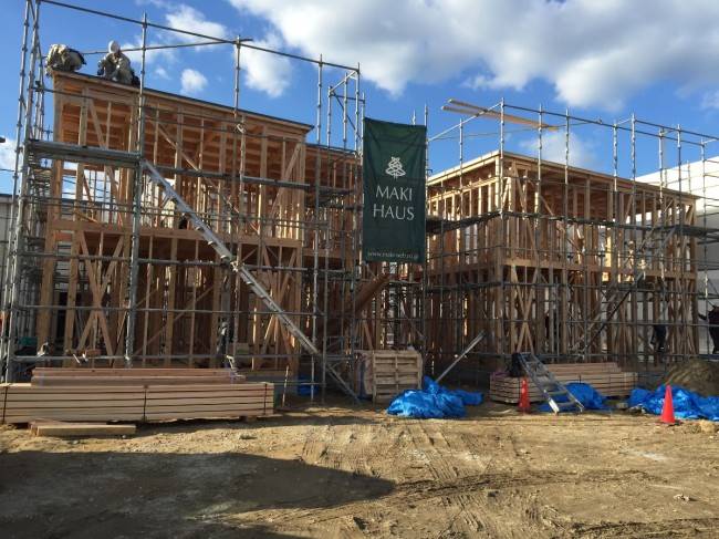 さて、今日はC・E棟の棟上げです。まずは御神酒で安全祈願『ご安全に』