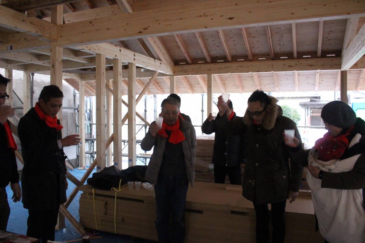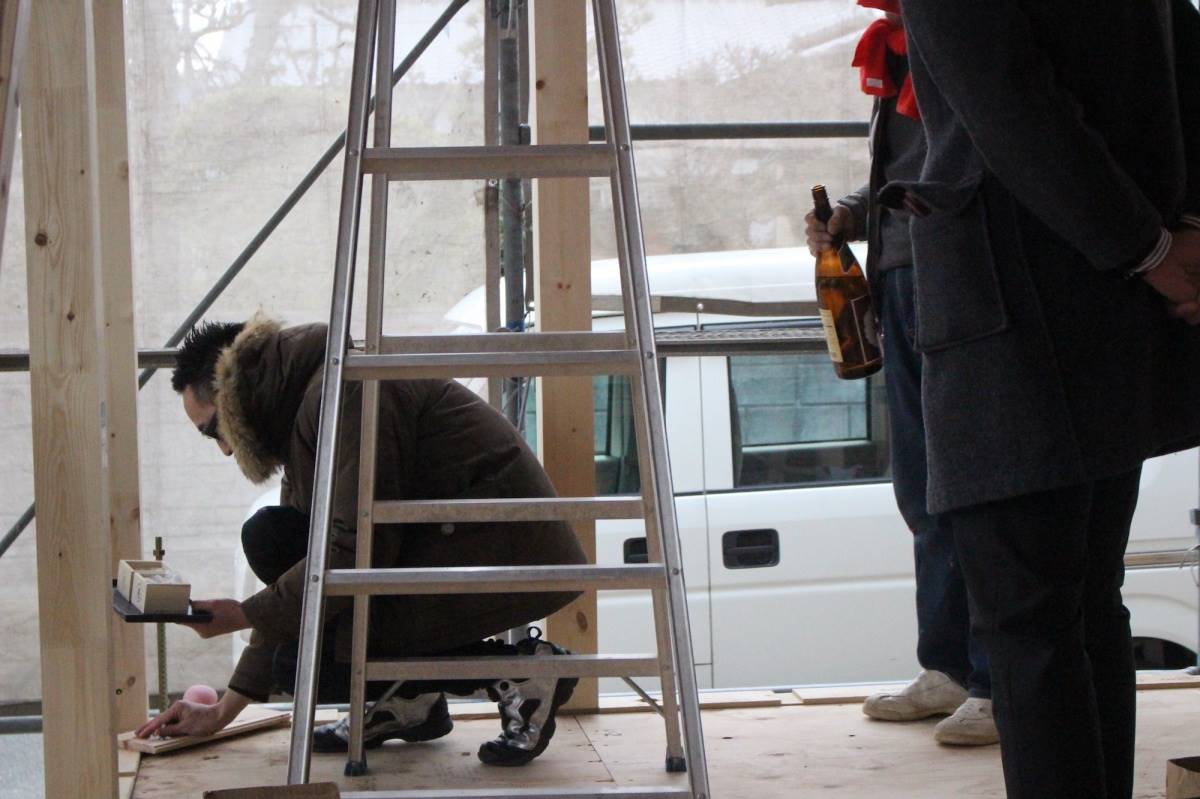 家の四隅に、お施主様と棟梁で酒と塩と米をまいて清めます。