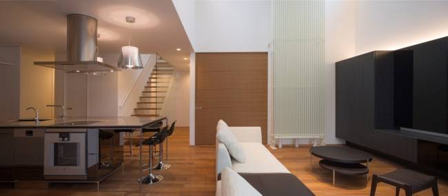 シンプルな内装が、リビング、キッチンの設備を際立たせる。
