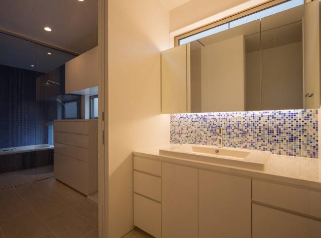 キメの細かい青いタイルが作り出すリラックスできるバスルーム是非、みなさまの家づくりの参考にされてください。