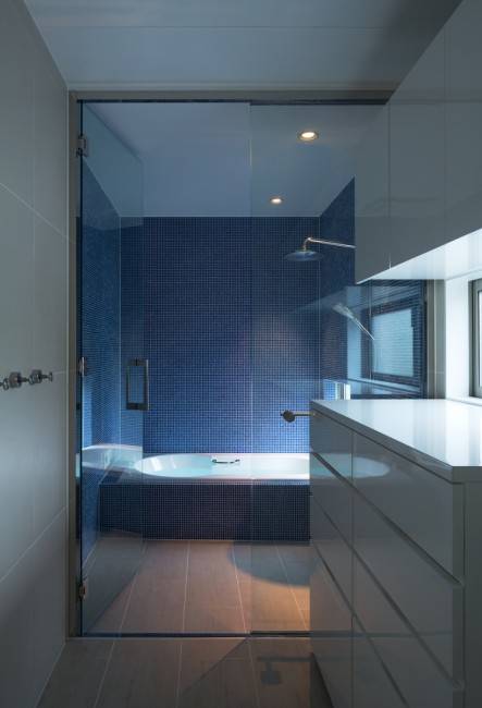 キメの細かい青いタイルが作り出すリラックスできるバスルーム