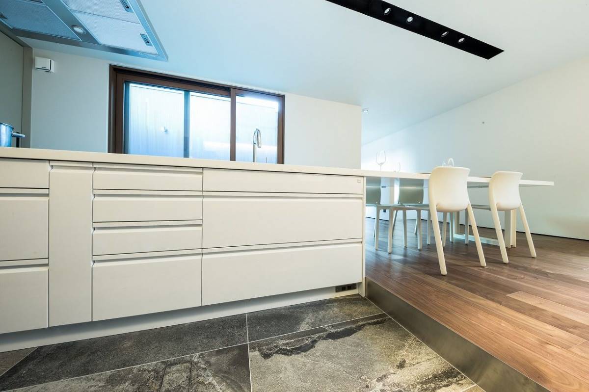 料理を作りながら、食事をしている家族や仲間と同じ目線で会話を楽しむために、キッチン部分はダイニングより一段下っています。