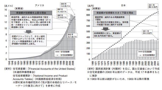住宅投資額の累計と住宅資産額の日米比較中古住宅流通の現状と課題 より