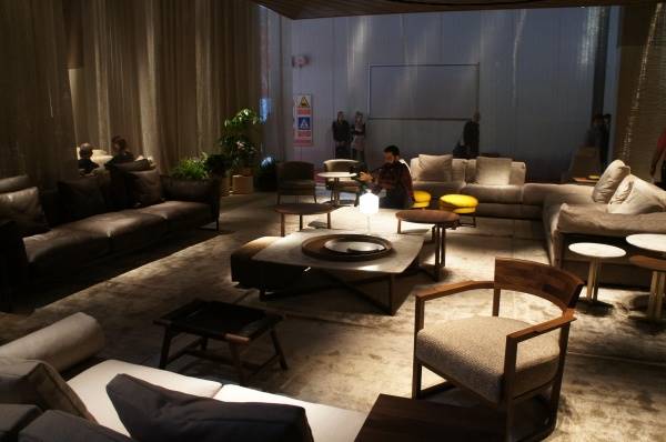 通常家具の展示と言えば、ソファにはクッションをテーブルにはカップやキャンドルなど小物がライフスタイルを想起させ、家具の魅力を引き立ててくれると、考えがちですが、今年の展示では、家具そのもの単体を展示しているブランドが多数あったようです。一段上に凛とした様子で展示されたそのモノは、ボーダーが張ってあるわけではないのに、なんだか触れない、視覚からそのモノの美しさを感じることを期待しての展示だったのでしょうか。ですが、やはり実際に座って触って体感することが大切ですので、別会場ではたっぷりとライフスタイルを想起させる展示が用意されており、展示の役割を分けるような試みだったのかしれません。