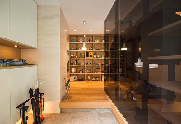 玄関正面、お気に入りコレクションのディスプレイスペースを配置。