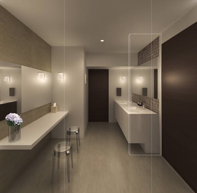 こちらは女性のためのメイクルームです。身支度の際に混み合わないように洗面化粧台は2ボウル式に。広いスペースをゆっくりと使えます。化粧台前には大きな鏡があり、抜群の使いやすさです。