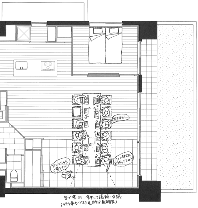 ダイニングテーブルを動かして向きを変えればミーティングもできます。いつもとは違った空間で、いい案がたくさん生まれそうです。