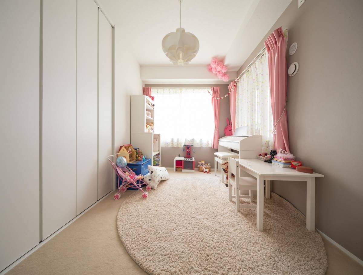 壁紙を主張しない落ち着いた色合いのクロスで、カーテンをビビッドなピンクで仕上げました。カーテンやお花の飾り物のピンクがアクセントとなった女の子らしいお部屋です。