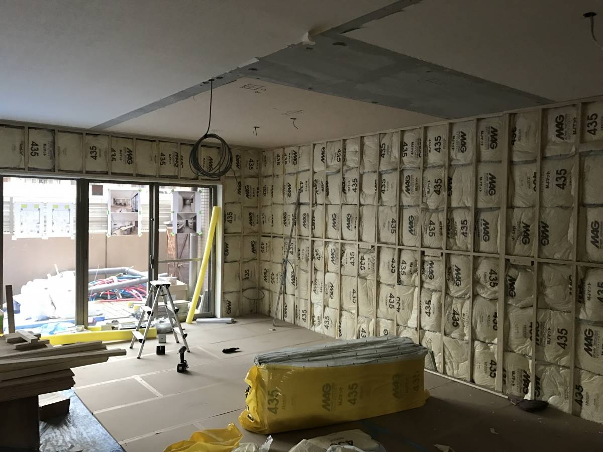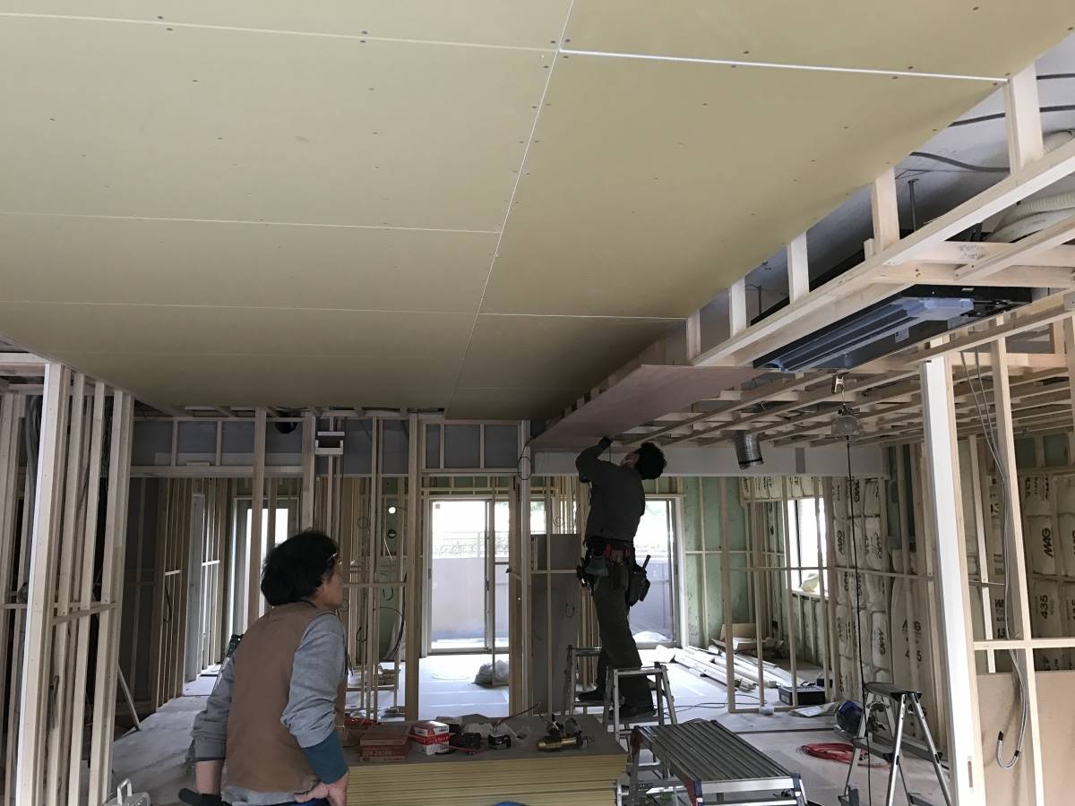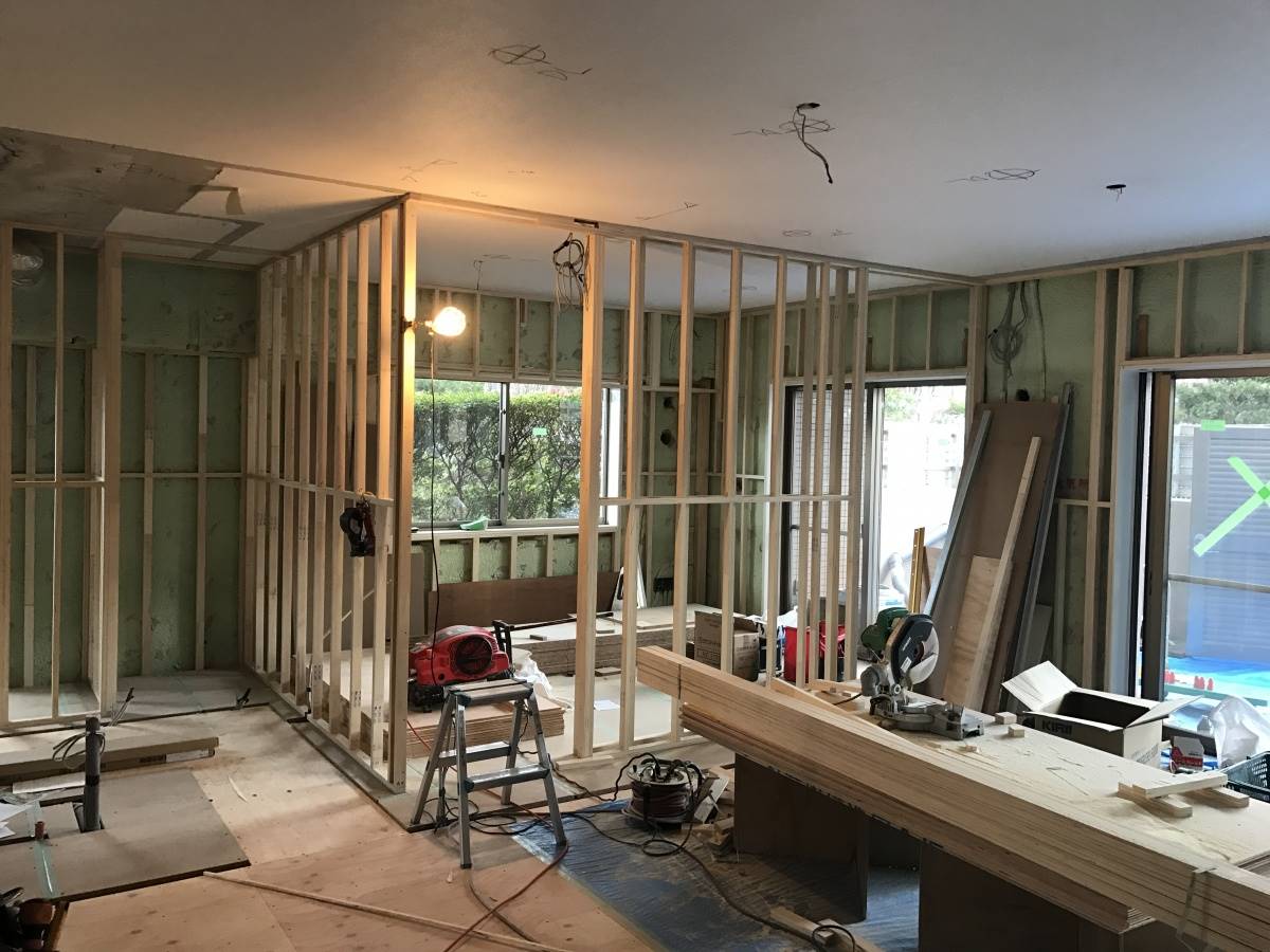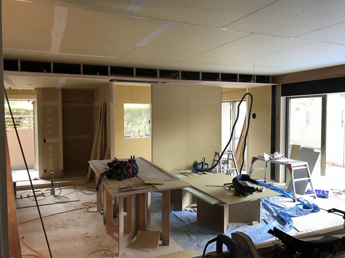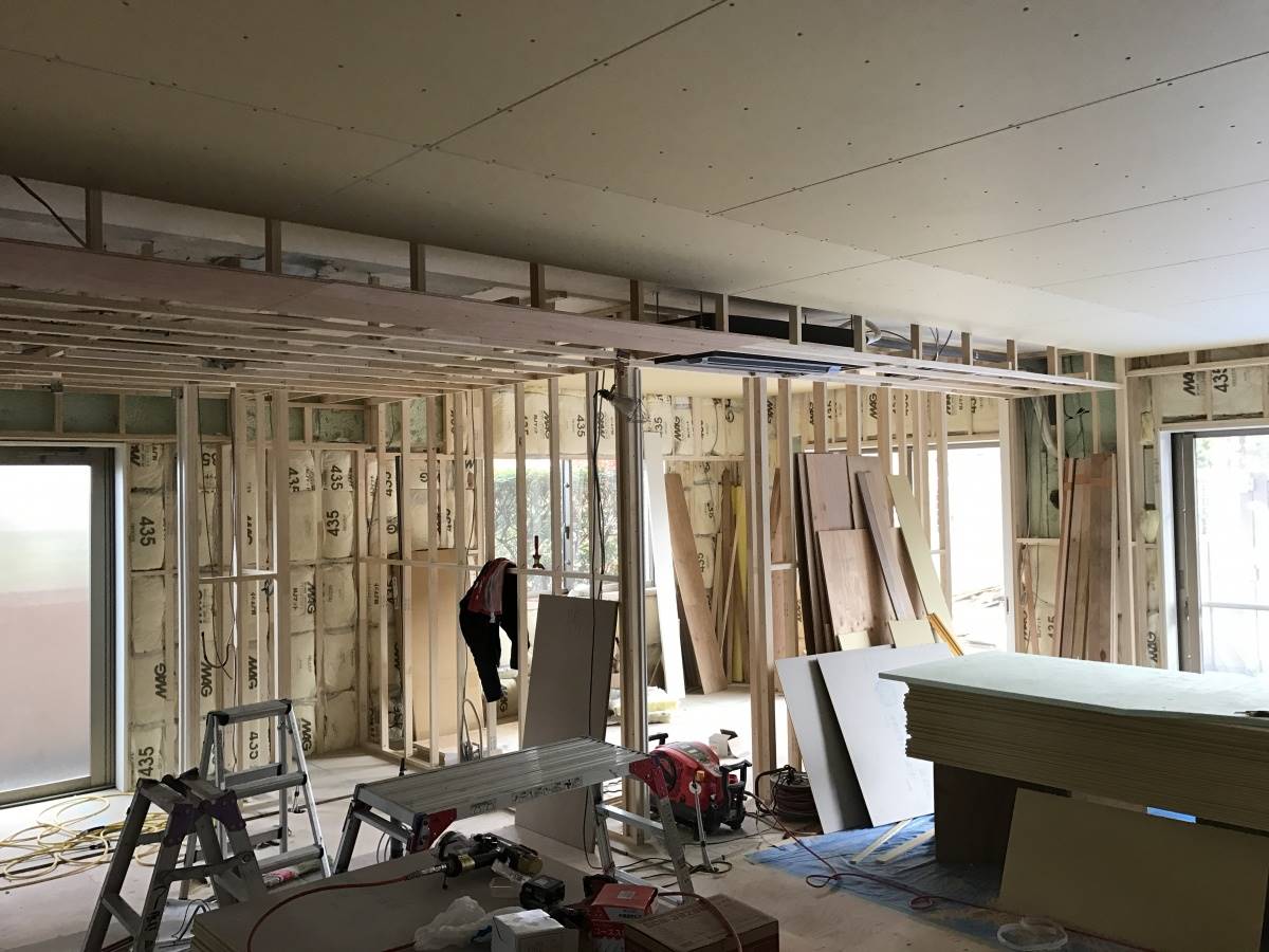 ボードが貼り終わるとようやく図面の通りに空間が見えてきます。木下地工事完了まで約一カ月。内装仕上げの工事に入る前のこの期間はなかなか空間のイメージがしづらく、一見、工事は進んでいるのかな…と思われるかもしれませんが、見えない部分の工事を着々と進めておりますのでご安心ください。リノベーションとはこれまであった住まいを再生させること。見た目が美しくきれいに生まれ変わるのはもちろんですが、このような住まいの基礎となる部分もしっかりと再生させ、これから先も安心してお住まいいただけるための土台を造ることが大切であると私たちは考えております。