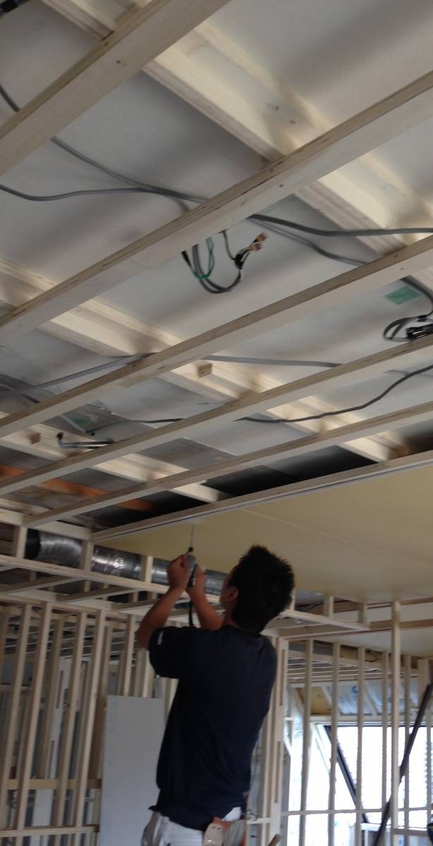 合板とは、薄い板を貼りあわせて作った板でのことです。絵や壁掛けテレビを設置するときや洗面室などで意匠的にタイルを貼るときなど、下地にある程度強度を必要とする際に貼ります。一番薄いもので、2.3mmそして、3, 4, 5.5, 9, 12, 15mmと厚さ30mmまで種類が豊富です。壁紙を貼った後には壁の補強ができませんので、お打合せの中で補強が必要な箇所を確認していきます。