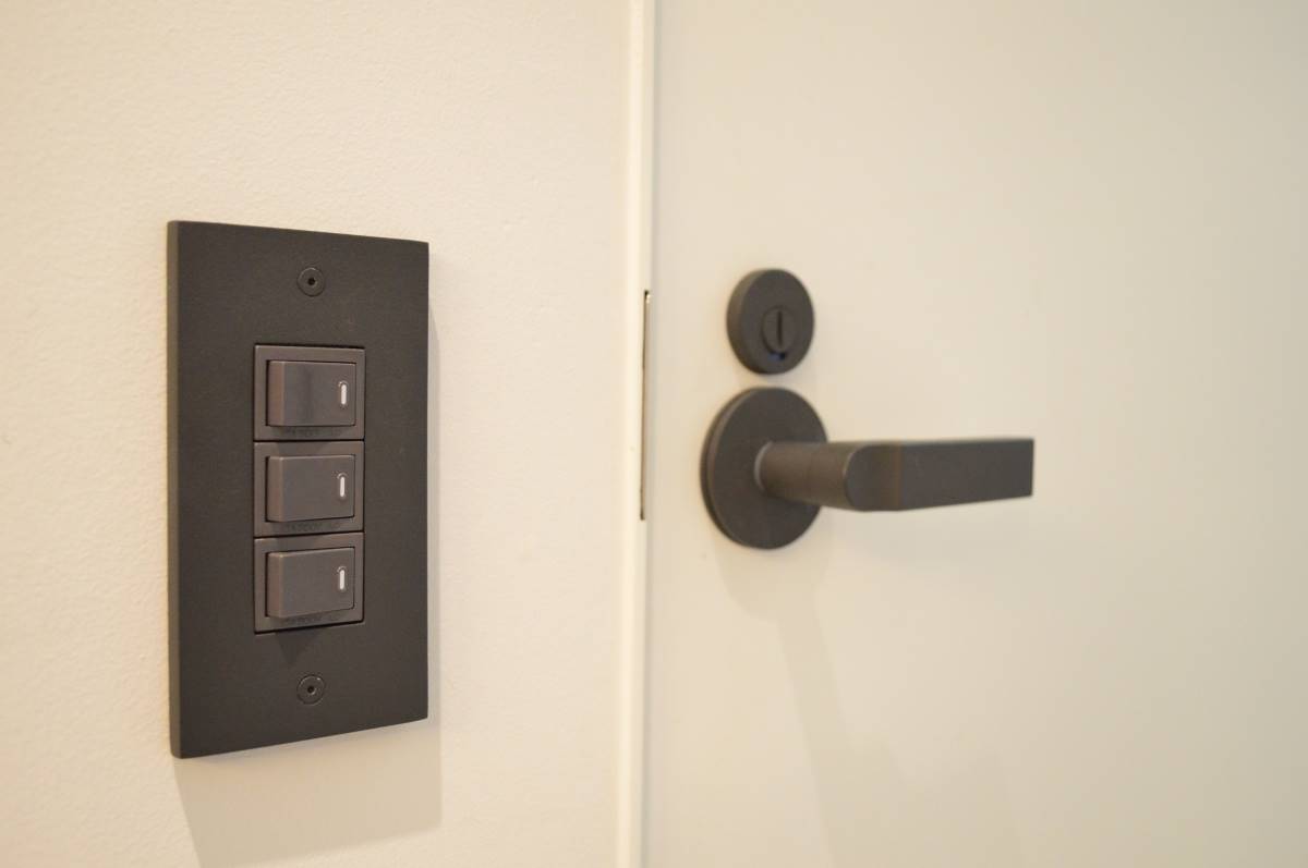 オリジナルのスイッチプレートです。同じくオリジナルのレバーハンドルと同様、艶のない素材で指紋が着きにくく、またレバーハンドルと並べた時に統一感が出ます。スイッチ本体を黒にすると、とてもモダンな雰囲気になりますね。