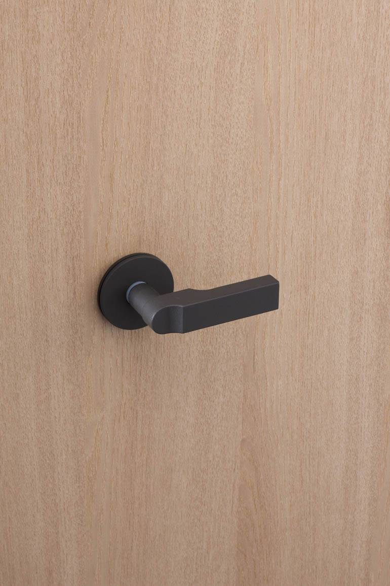 当社オリジナルのレバーハンドルです。通常のレバーハンドルより少し持ち手が短めで、ハンドルを握った時に手のひらにフィットする感覚が特徴的です。艶のないザラザラとした肌触りですので、指紋が着くこともありません。是非実際に触れてみていただきたい逸品。当社の平尾事務所に実物がございます。