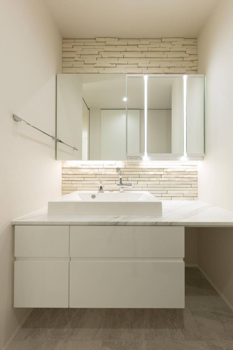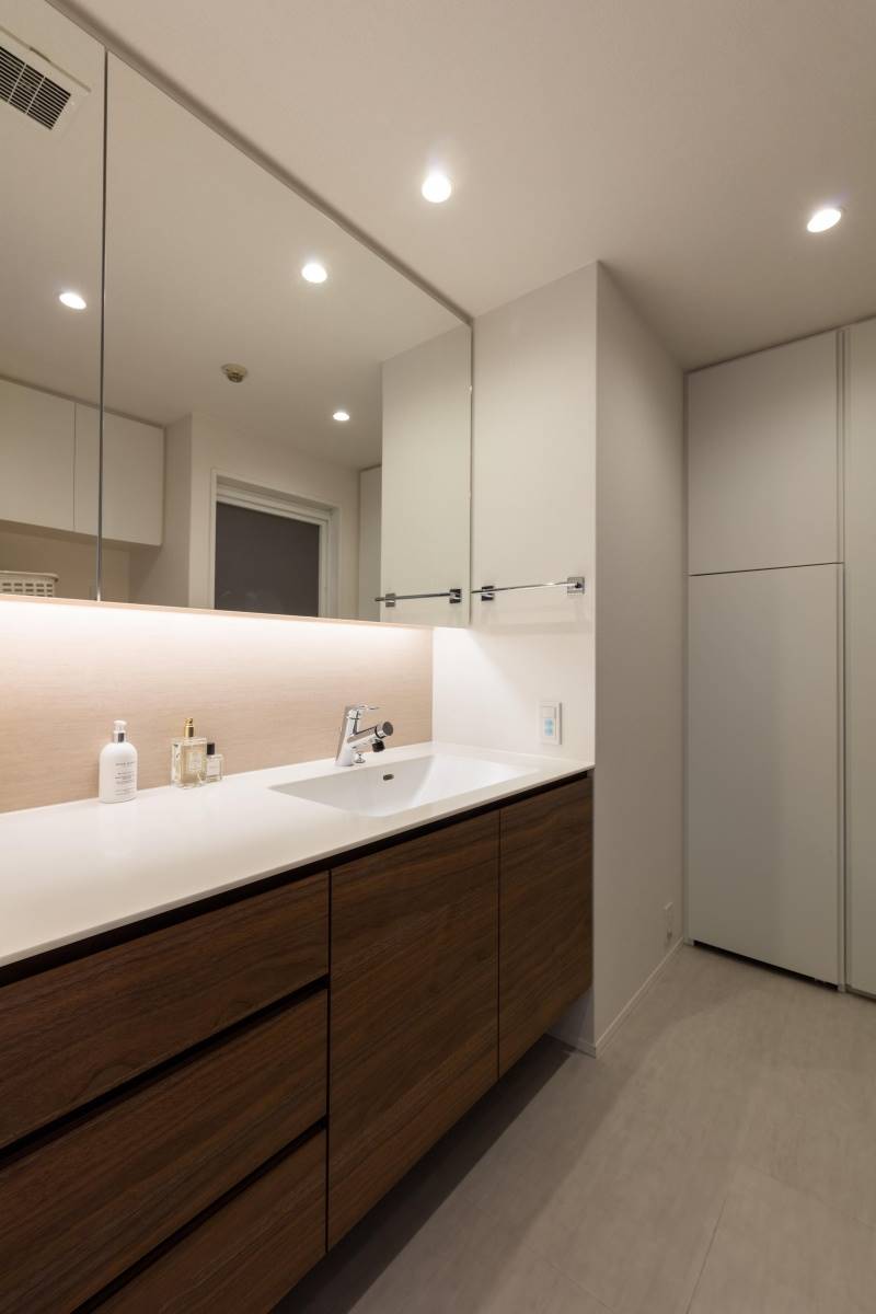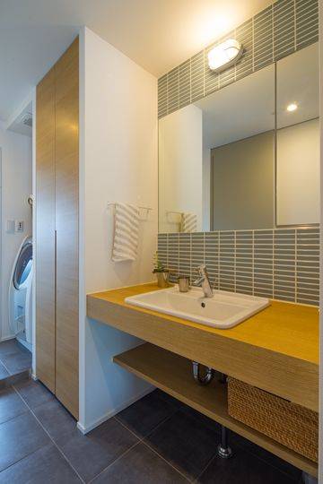 こちらの洗面室は、シンクをカウンターと一体型の人造大理石にし、鏡との間にはメラミン化粧板を貼りました。どちらも水や汚れに強い素材でお手入れがしやすく、シンプルですがとても使いやすい素材です。洗面室は日々汚れるので、お手入れがしやすいものが奥様には人気です。