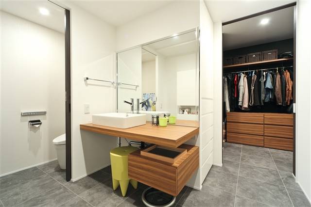 こちらはクローゼットと繋がっているオープンなタイプの洗面室です。リノベーションは自由設計ですので、洗面室のあり方も思いのまま。クローゼットやトイレと?がっていたり、玄関から直接アクセスできたり、住む人にとって一番使いやすい位置に自由に洗面室を配置できます。