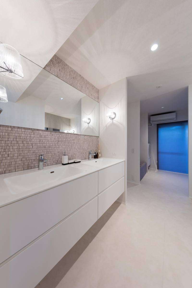 「ホテルのような洗面室」をイメージして思い浮かぶのがこの2ボウルタイプの洗面室だと思います。家族が多いご家庭では、朝の洗面室の渋滞は毎日のストレスです。広々とした洗面室で日々の身支度を快適にしたいものです。