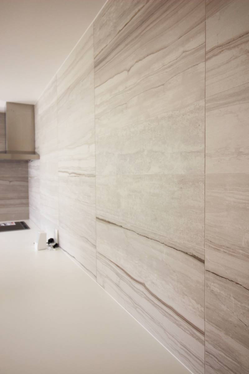 キッチンの背面の壁は、石目調のタイルで