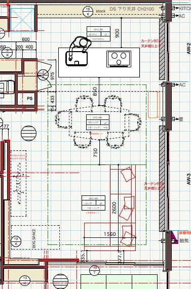 ・ダイニングテーブルの位置から割り出したソファの位置(人がストレス無く行き来できるスペースを考えて)