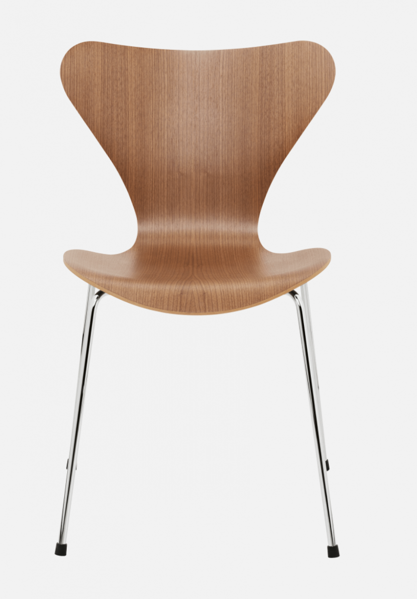 デンマークが生んだ偉大な建築家アルネ・ヤコブセンは、プライウッド(芯材に薄くスライスした木材を積み重ねて接着した合板)に加工を施し曲面に成形加工した「成形合板」により、世界で初めて椅子の背と座面が一体となって成形された「アントチェア」を1952年に発表しました。その3年後の1955年、アントチェアに比べ背の部分が大きく広がり、より耐久性に優れ、洗練されたフォルムを持つ「セブンチェア」が発表され、その後現在までデザインの歴史に残る名作として世界中で愛されています。