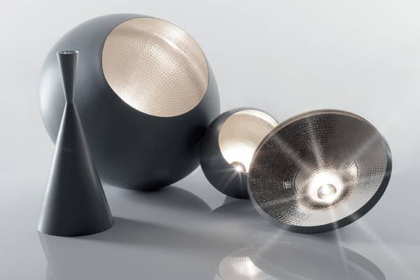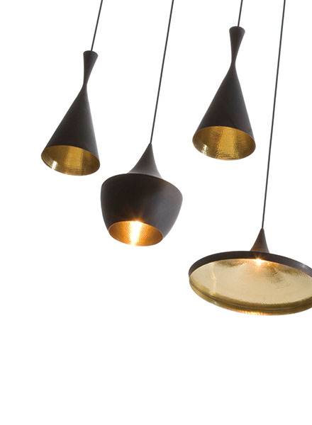 こちらが“Beat Light”のシリーズ。表面がつや消しの黒やオフホワイトで、内部が真鍮の仕上げになっているのが特徴的です。光源はハロゲンで、点灯すると真鍮面に当たる光がギラッと反射し、表面とは真逆の華やかな表情が現れます。住宅はもちろんのこと、国内外の多くの商業施設や宿泊施設で見ることができます。(類似品も多く出回っています)
