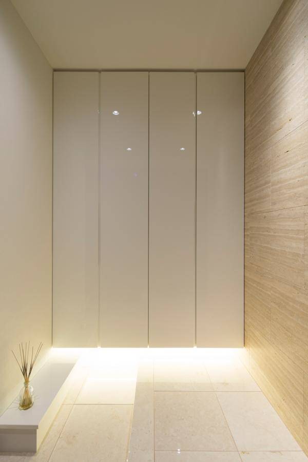 玄関の土間部分に備え付けのシューズボックスを造ります。内部は可動式の棚板になっているので、靴が増えても棚板を増やすことができます。床から天井までの高さで大容量ですので、5人家族分の靴でも収納可能です。収納の下に間接照明を入れて床を照らすことで、土間の部分が広く見える工夫もしています。
