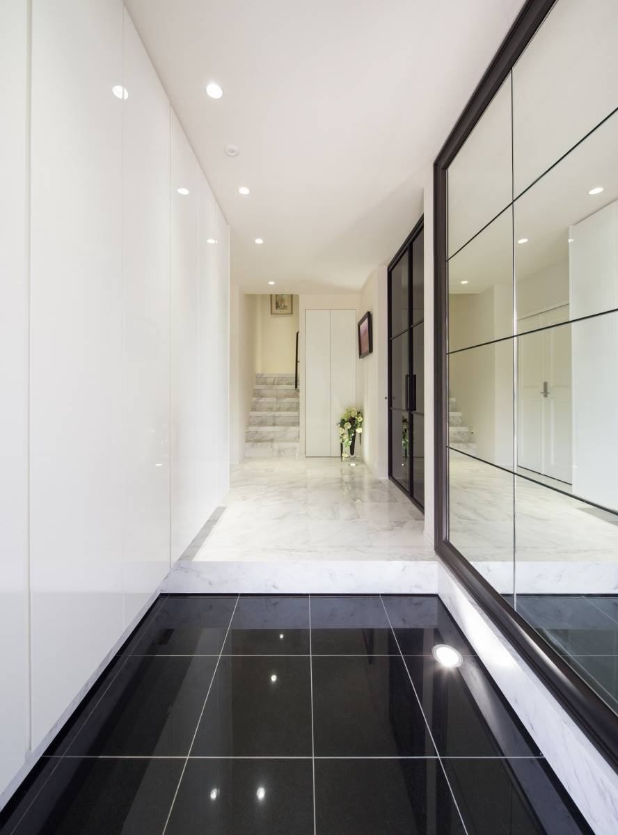 横の広がりを感じさせるためには鏡が効果的です。上の写真のように周りにフレームを付けたり鏡をいくつかに分けたり、オリジナルの鏡をデザインすることももちろん可能です。既製品の鏡では高さがぴったりとは合いませんが、造作で造る場合には床から天井までぴったりの高さで造ることができ、より玄関を広く見せることができます。