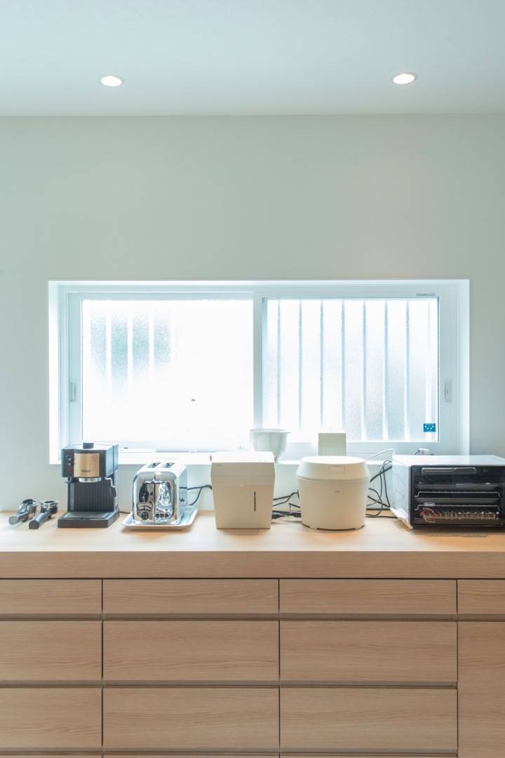 家電類はなるべく外に出したくないもの。電話、FAX、プリンターなど、家の中の家電も寸法に合わせて造ったリビング収納に仕舞っておけば大丈夫。目立たず埃を被る心配もありません。