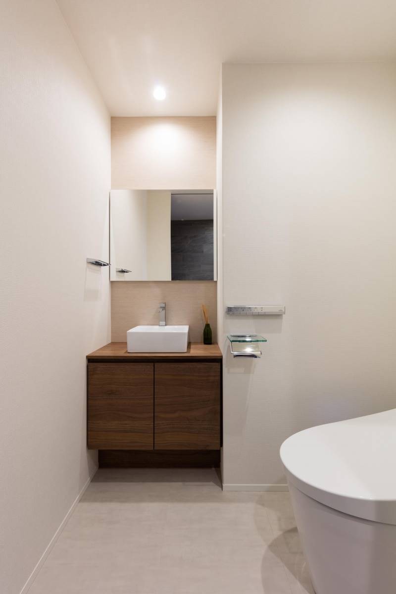 トイレと洗面室は白を基調にリビングと同じウォルナットでアクセントをつけました。家全体のテーマカラーとなるウォルナットが水廻りにも表現され、空間全体に統一感が生まれました。