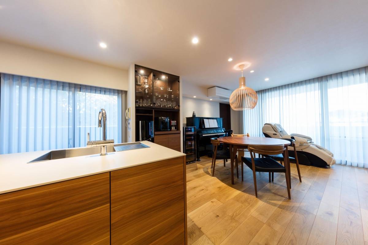 カラーは家具と建具をシックなウォルナットに、床をそれよりも明るいオークで仕上げました。色のコントラストがはっきりとしているのでぼやけたイメージにならず、メリハリがついたモダンな雰囲気に仕上がりました。