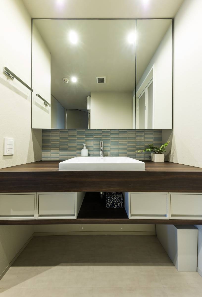 洗面室。ウォールナットの濃い色にあったボーダータイル選びにこだわりました。