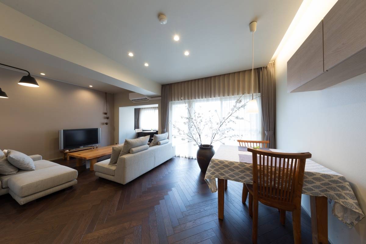 床はウォールナットのヘリンボーン。個性的な雰囲気が出ます。
