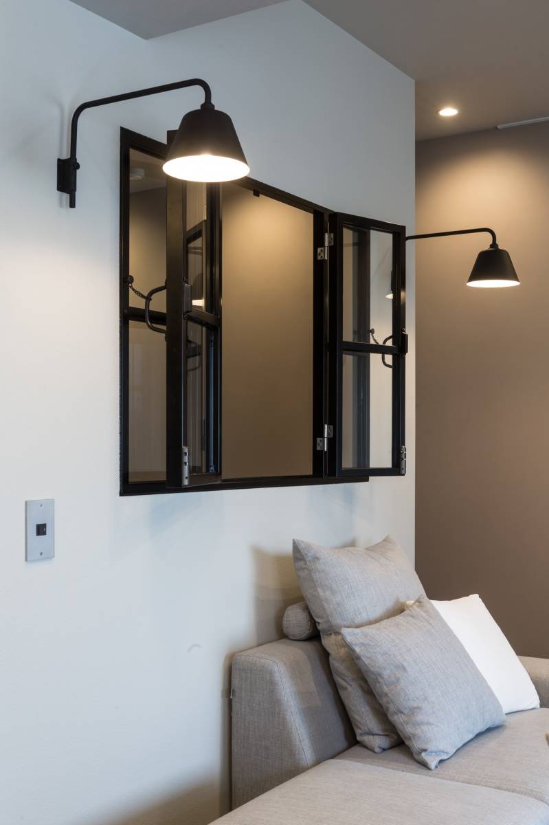 リビングに面した寝室の壁にはアクセントとなる小窓とおしゃれなブラケットを付けました。黒のフレームがカフェっぽい雰囲気を演出してくれます。