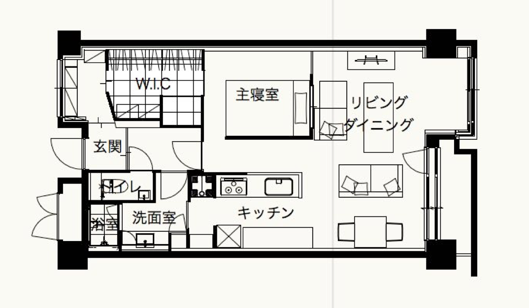 約70㎡の空間を一人暮らし用に贅沢に使った部屋です。ワンルームっぽくもありますがプライベート空間は程よく仕切り、一人用ではあっても来客に対応できるように考えました。間取りはこちら↓